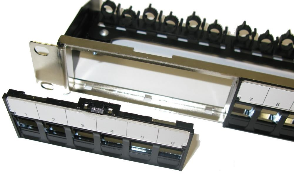 včetně montážní sada M6 do rozvaděčů (4x šroubek + 4x matka + 4x podložka) Kovový patch panel s unikátním způsobem instalace keystonů s vyvazovákem. Čelní panel překryt čtyřmi plasty po 4 otvorech, možno osadit 4 moduly po 6 pozicicíh pro keystony. Zemnící kabel a pozice pro umístění popisek