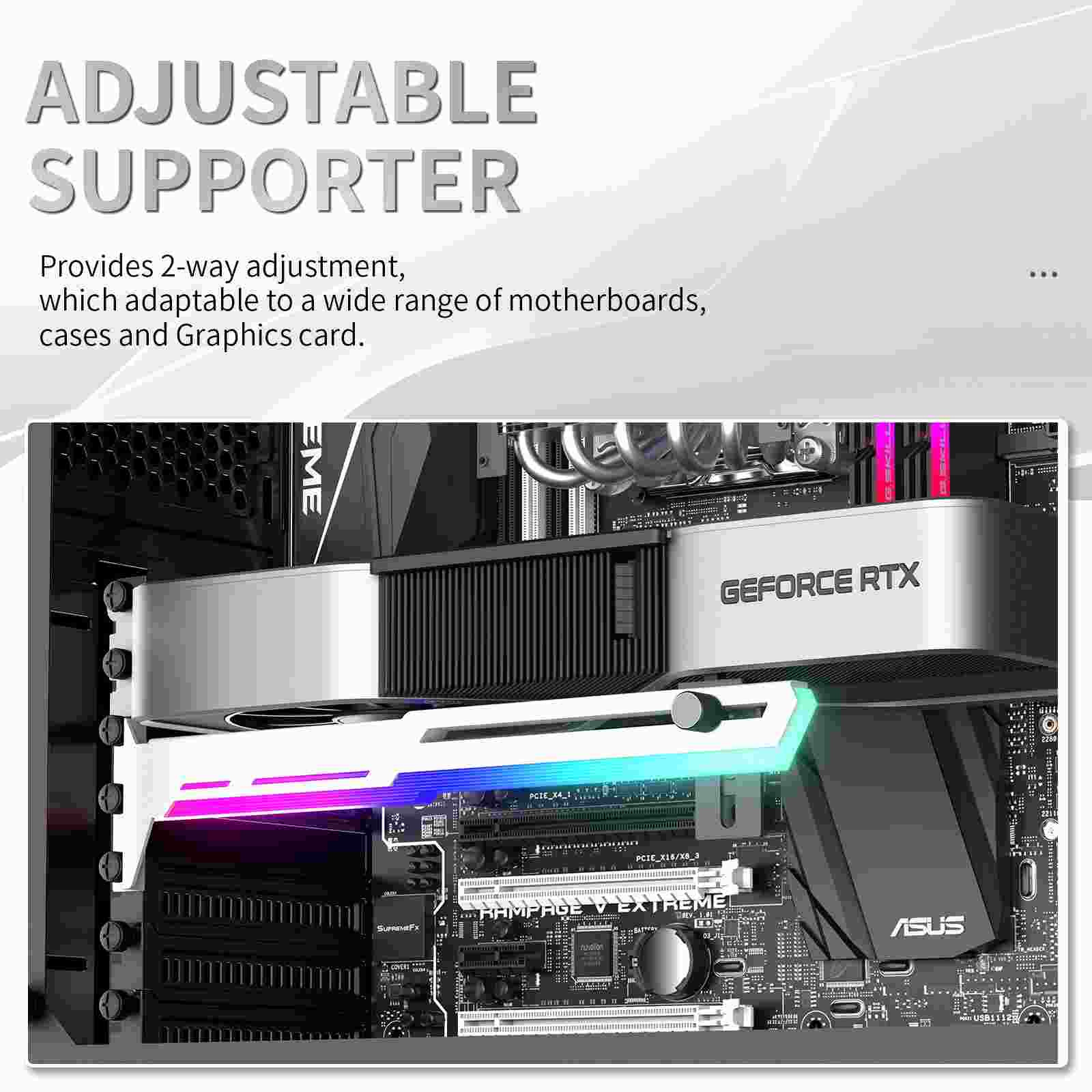 Stylová varianta této opory Vaší grafické karty je vyrobena z ocelového práškově lakovaného plechu a plastu, zabraňuje prohýbání větších karet ve slotu a dodává tak sestavě lepší celkovou stabilitu. Součástí je silikonová posuvná opora, kterou lze posunout jak horizontálně tak i vertikálně a umožňuje instalaci v různých místech karty, pro maximální kompatibilitu s většinou karet. Rozměry držáku jsou 280 x 52mm.