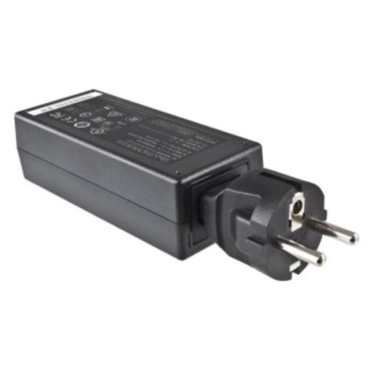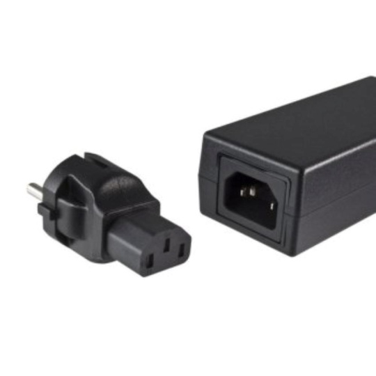 Napájecí adaptér v černém provedení, se vstupním konektorem CEE 7/7 a výstupním IEC C13. Výstupní zásuvka je rovná, německého typu, s ochrannými plíšky po stranách, vhodná pro připojení vidlice, která je vybavena zemnícími plíšky po stranách.