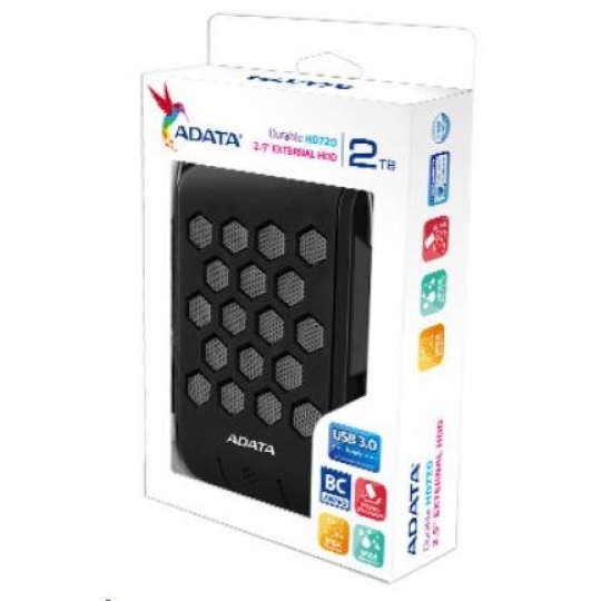 ADATA Externí HDD 2TB 2,5" USB 3.2, DashDrive™ Durable HD720, G-sensor, černý, (gumový, vodě/nárazu odolný)