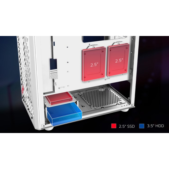Dvě odnímatelné 2,5” HDD/SSD desky pro snadnější montáž nebo výměnu. Uživatelé mohou také nainstalovat klec HDD a přidat buď dva 3,5" nebo 2,5" plus 3,5" disk pod přední stranu krytu PSU. Klec HDD je poskytována jako příslušenství při rozbalování XPG VALOR AIR, jako flexibilní možnost, ze které si uživatelé mohou vybrat při instalaci úložiště.