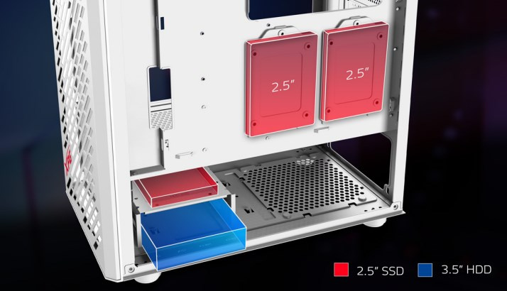 Dvě odnímatelné 2,5” HDD/SSD desky pro snadnější montáž nebo výměnu. Uživatelé mohou také nainstalovat klec HDD a přidat buď dva 3,5" nebo 2,5" plus 3,5" disk pod přední stranu krytu PSU. Klec HDD je poskytována jako příslušenství při rozbalování XPG VALOR AIR, jako flexibilní možnost, ze které si uživatelé mohou vybrat při instalaci úložiště.