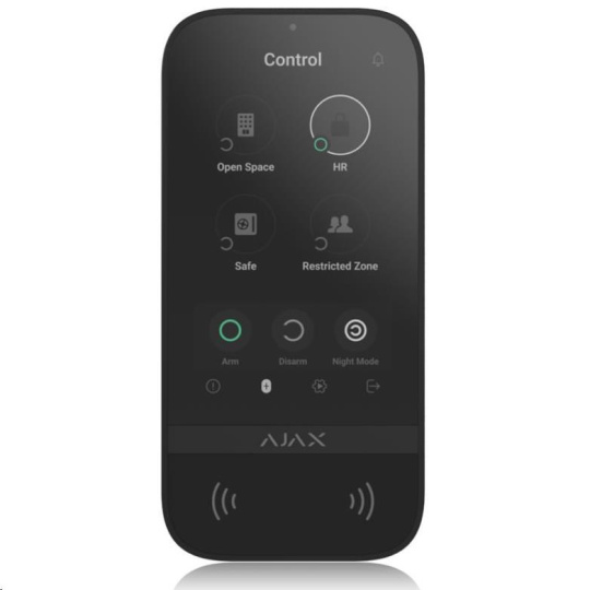 Klávesnice KeyPad TouchScreen zdědila rozhraní aplikací Ajax pro chytré telefony a poskytuje tak snadné a známé ovládání systému. Pětipalcová dotyková obrazovka umožňuje rychlý přístup k aktuálnímu režimu zabezpečení jakékoli skupiny. Aktivuje se zvednutím ruky v blízkosti a má automatickou regulaci jasu. Klávesnice má zvukovou indikaci a může upozorňovat na alarmy, zpoždění při vstupu/odchodu a otevření dveří při odjištění systému. Hlasitost se nastavuje v aplikacích Ajax. Klávesnice také zobrazuje výsledek kontroly integrity systému a informuje o poruchách při zastřežení.