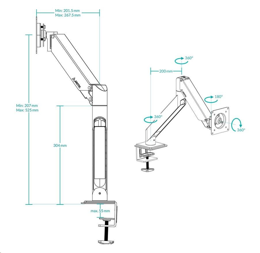 - SIMPLE AND QUICK ASSEMBLY - Thanks to the table clamp, the monitor arm can be placed freely and easily on the edge of the table. The arm is completely pre-assembled and is simply placed on the rod. Assembly or later repositioning is therefore child's play and can be done quickly.