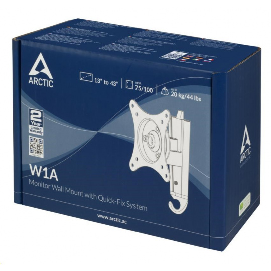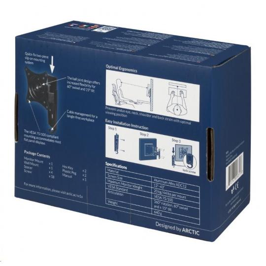 The ARCTIC W1A is a single pivot 3 axis articulation bracket mount, offers smooth adjustable screen angle with 360° rotation, 60° swivel and ±15°tilt. The ball joint design gives the flexibility to perfectly position your monitor to reduce eye, neck, shoulder and back strain. It mounts closely to the wall and maximise your work area. Compatible with monitors from 13" to 43", the two-piece direct mounting system allows quick installation and support up to 20 kg in weight.