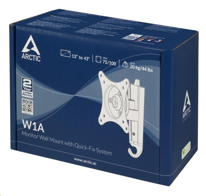 The ARCTIC W1A is a single pivot 3 axis articulation bracket mount, offers smooth adjustable screen angle with 360° rotation, 60° swivel and ±15°tilt. The ball joint design gives the flexibility to perfectly position your monitor to reduce eye, neck, shoulder and back strain. It mounts closely to the wall and maximise your work area. Compatible with monitors from 13" to 43", the two-piece direct mounting system allows quick installation and support up to 20 kg in weight.