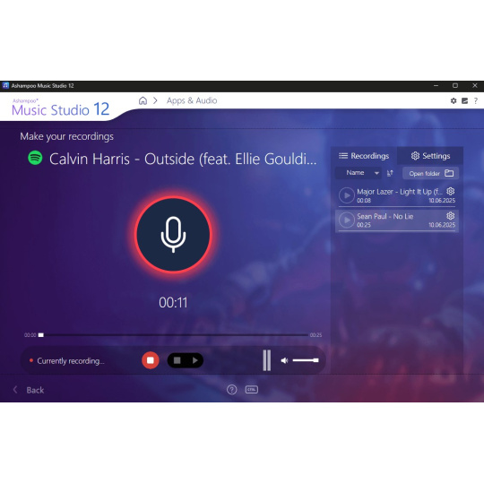 Máte dlouhý seznam nahrávek? Žádný problém! Nový a vylepšený seznam nahrávek v aplikaci Music Studio 12 zobrazuje všechny klíčové informace na první pohled a působí mnohem efektivněji. Nahrávky nyní můžete řadit podle názvu, data nebo délky trvání – vzestupně nebo sestupně. Takto vždy najdete přesně to, co hledáte, bez ohledu na to, jak velká je vaše sbírka.