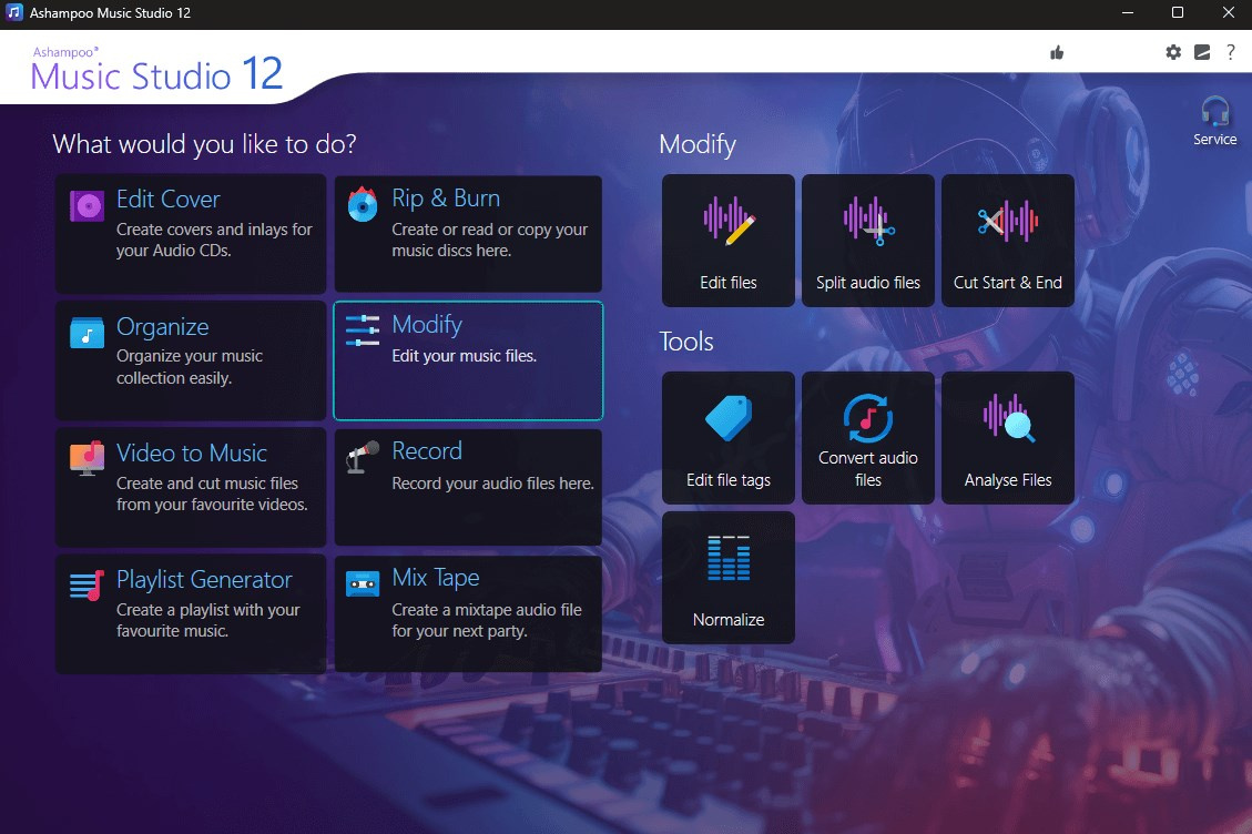 Ashampoo Music Studio je švýcarský nůž pro vaši hudbu. Nabízí komplexní sadu nástrojů pro snadnou editaci, produkci, trimování, mixování a organizaci hudebních a audio souborů.