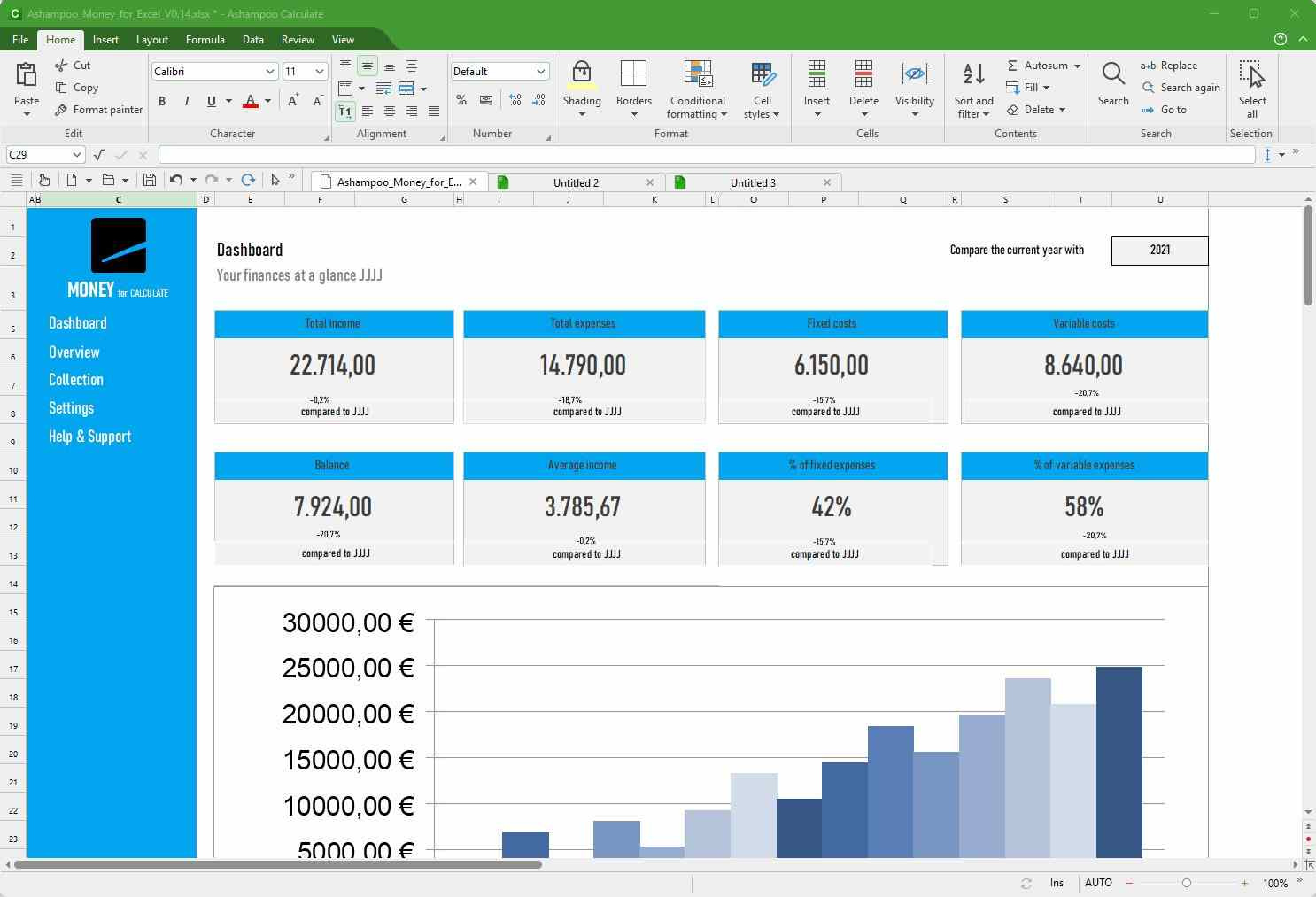 Vytváření složitých výpočtů a grafů v tabulkách může být obtížné: S aplikací Calculate z balíku Ashampoo Office 9 je to zábavné a poutavé. Od jednoduchých rozvrhů až po složitou firemní finanční dokumentaci - Calculate je kapkovitá náhrada Excelu se všemi funkcemi a žádnou nekonzistencí. Nabízí okamžité zvýraznění syntaxe a ověřování vzorců, které vám pomohou odhalit chyby během několika sekund. S více než 350 výpočty, snadnou manipulací s tabulkami a podporou obřích datových listů s miliony položek je Calculate 9 ideální pro jakoukoli tabulkovou úlohu. Funkce na profesionální úrovni, jako jsou otočné tabulky, uspokojí i ty nejpokročilejší uživatele. A tisk hotových tabulek je mimořádně snadný díky novému náhledu zalomení stránky. Calculate 9 používá formát souborů XLSX, tedy stejný formát, jaký používá Microsoft Excel!