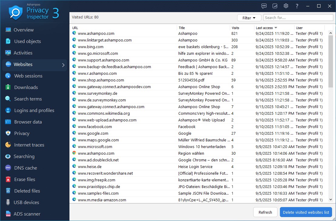 Hledané výrazy se nyní zaznamenávají nejen ze všech prohlížečů a uživatelských profilů, ale také z Průzkumníka Windows. Nyní máte přístup ke všem datům napříč profily a můžete používat praktické filtry pro lepší organizaci. Díky optimalizované správě paměti a nové podpoře více jader pracuje Ashampoo Privacy Inspector plynuleji než kdy dříve, a to i při rozsáhlých analýzách!