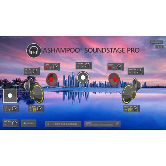 Ashampoo Soundstage Pro poskytuje mnohostranný zážitek z poslechu. Zvukové standardy jako 5.1, 6.1 a 7.1 v kombinaci s deseti virtuálními místy vytvářejí sofistikované zvukové prostředí, přičemž zadní a boční reproduktory jsou snadno identifikovatelné. Ashampoo Soundstage Pro neprovádí upscale stávajících zvukových signálů, ale závisí na existenci skutečných prostorových informací v původním zvukovém signálu. Jedině to zaručuje vysoce kvalitní zvukový zážitek!