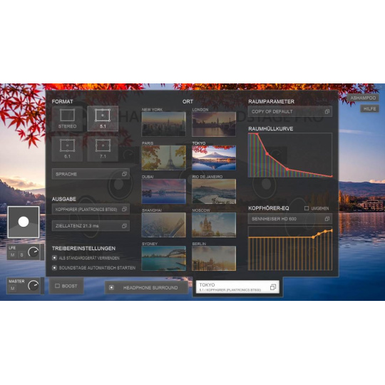 Program vám nabízí deset různých zvukových míst, ze kterých si můžete vybrat! Tyto předvolby byly vytvořeny odborníky v profesionálních nahrávacích studiích. Vyzkoušejte si celou škálu věrného prostorového zvuku! Samozřejmostí je individuální nastavení hlasitosti pro každý virtuální reproduktor!