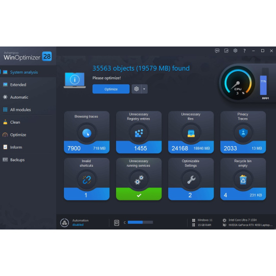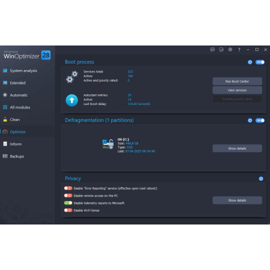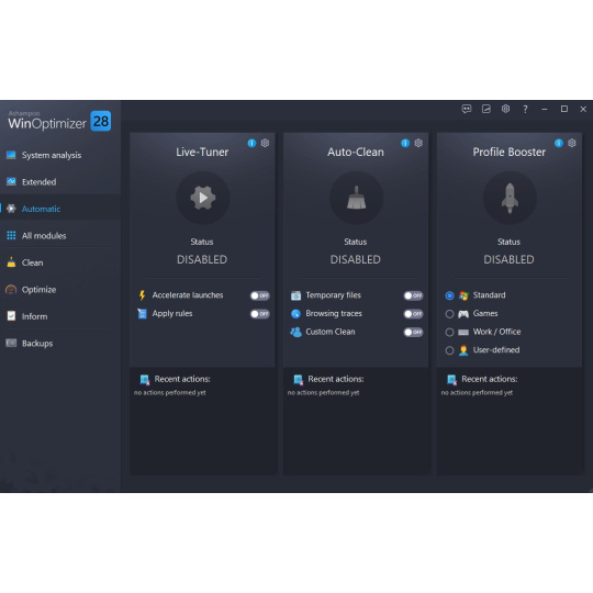 Automatická optimalizace systému Windows je již dlouhou dobu nedílnou součástí programu WinOptimizer. Je na čase postarat se o zbytek! Tuning Assistant vám položí několik jednoduchých otázek s dalekosáhlými důsledky. Každá odpověď vás přiblíží k rychlejšímu, diskrétnějšímu a bezpečnějšímu počítači se systémem Windows - a to vše při neformální konverzaci s naším softwarem. Vypněte nepotřebné služby na pozadí, optimalizujte nastavení zabezpečení a přizpůsobte systém Windows pro lepší výkon a soukromí, a to bez rizika!