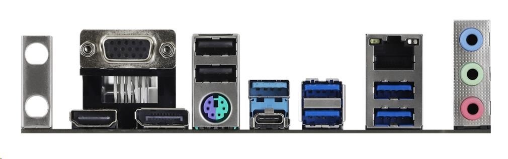 | Rear panel I/O | - Antenna Bracket - 1 x PS/2 Mouse/Keyboard Port - 1 x D-Sub Port - 1 x HDMI Port - 1 x DisplayPort 1.4 - 1 x USB 3.2 Gen1 Type-A Port (Supports ESD Protection) - 4 x USB 3.2 Gen1 Type-A Ports (ASMedia ASM1074 hub) (Supports ESD Protection) - 1 x USB 3.2 Gen1 Type-C Port (Supports ESD Protection) - 2 x USB 2.0 Ports (Supports ESD Protection) - 1 x RJ-45 LAN Port with LED (ACT/LINK LED and SPEED LED) - HD Audio Jacks: Line in / Front Speaker / Microphone |