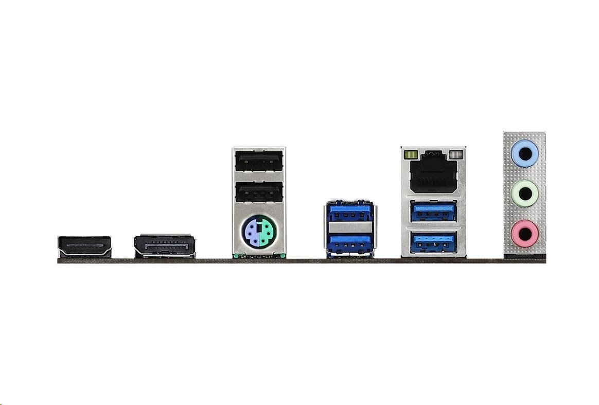 | Rear Panel I/O | - 1 x PS/2 Mouse/Keyboard Port - 1 x HDMI Port - 1 x DisplayPort 1.4 - 4 x USB 3.2 Gen1 Ports (Supports ESD Protection) - 2 x USB 2.0 Ports (Supports ESD Protection) - 1 x RJ-45 LAN Port with LED (ACT/LINK LED and SPEED LED) - HD Audio Jacks: Line in / Front Speaker / Microphone |