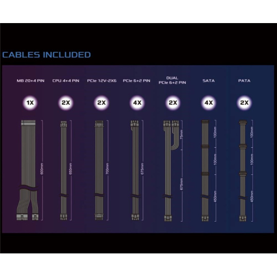 | Dueal PCIe 6+2 Pin Konektor | 2x / 2x (675 + 75 mm) |