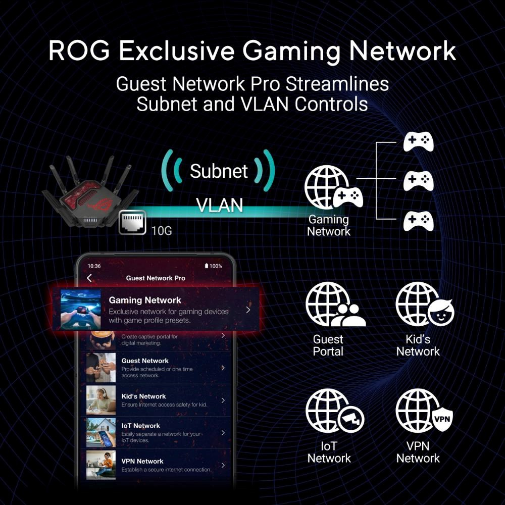 Řada ROG Rapture stále posouvá hranice možností v oblasti her a sítí. Nový ROG Rapture GT-BE19000 je třípásmový 12streamový herní router WiFi 7 přizpůsobený pro hry a počítače nové generace. S rychlostí až 1,9 Gb/s, výkonnou 31G kabelovou kapacitou a exkluzivní sítí ROG Gaming Network nabízí nové způsoby, jak urychlit vaše hraní.