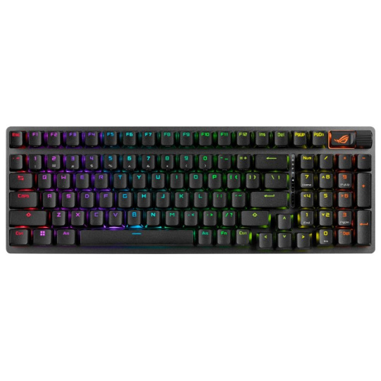 Herní klávesnice ROG Strix Scope II X s mechanickými spínači ROG NX V2 s možností výměny za provozu, pěnovým tlumením zvuku, zdvojenými klávesami PBT nebo ABS s UV povlakem, streamovacími klávesami, multifunkčními ovládacími prvky, třemi úhly sklonu a opěrkou zápěstí.