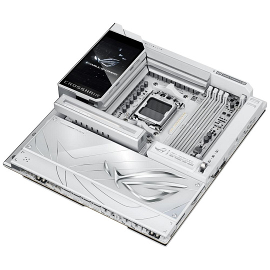 The ROG X870E Glacial is a flagship motherboard engineered for uncompromising performance and sophisticated AI. It boasts a robust 24+2+2 power stage design, Dynamic OC Switcher, and Core Flex for next-generation overclocking control. Meanwhile, advanced memory tuning is unlocked through server-grade DRAM enhancement and NitroPath DRAM technology, and storage scales with support for up to seven M.2 drives. Top-tier connectivity includes two 10G Ethernet ports, two USB4® ports, and two USB 20Gbps Type-C® front-panel connectors. This motherboard also features a 3D VC M.2 heatsink and a 5-inch LCD display, along with AI Cache Boost and AI Advisor for smarter, more intuitive system tuning.