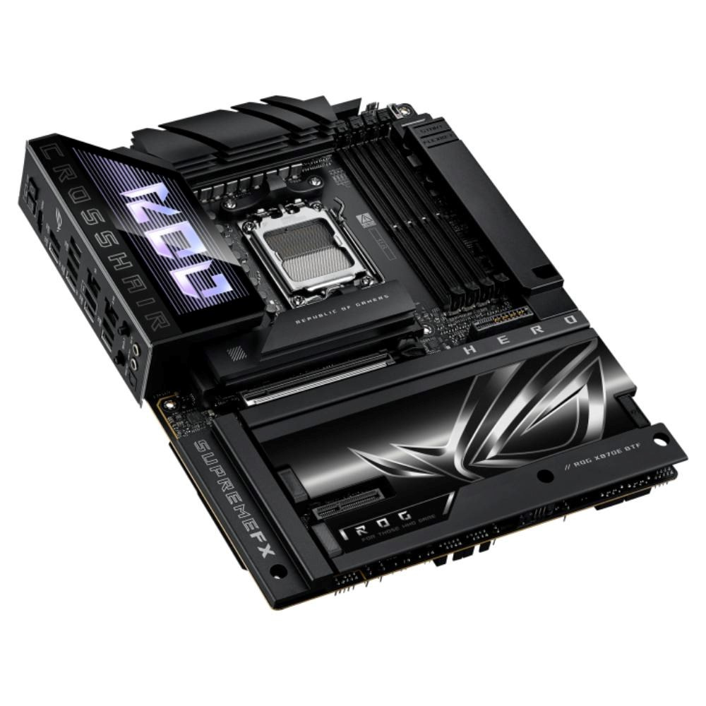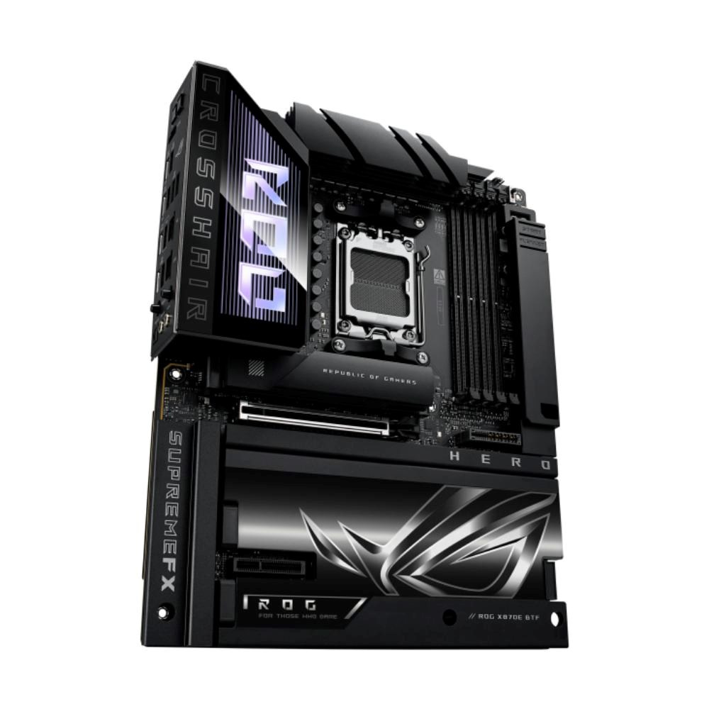 The ROG Crosshair X870E Hero BTF features hidden connectors for motherboard and GPU power, USB, and fan cables, delivering an ultra-clean look for your AMD Ryzen™ 9000 build. It pairs robust power delivery with ASUS-exclusive AI-enhanced tuning, PCIe® 5.0, and DDR5 slots with NitroPath DRAM Technology for advanced memory performance. Plus, Polymo Lighting II adds striking visual flair to your rig.