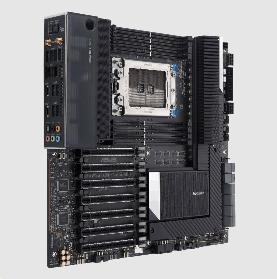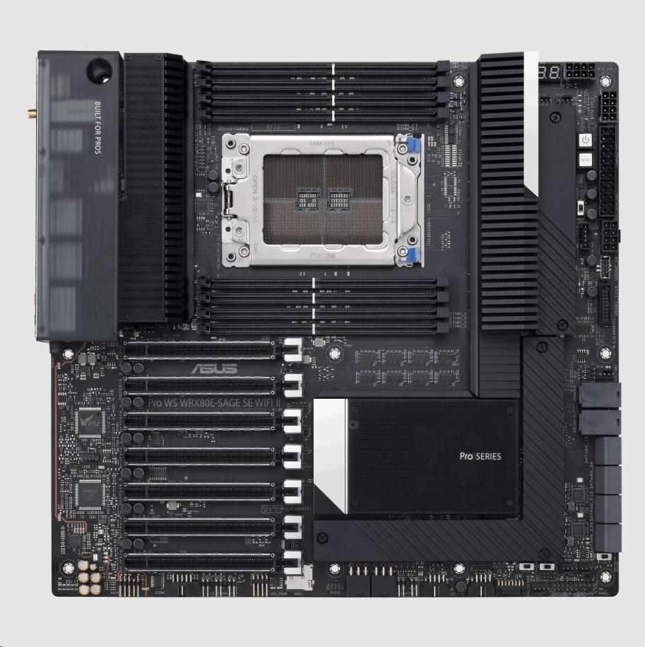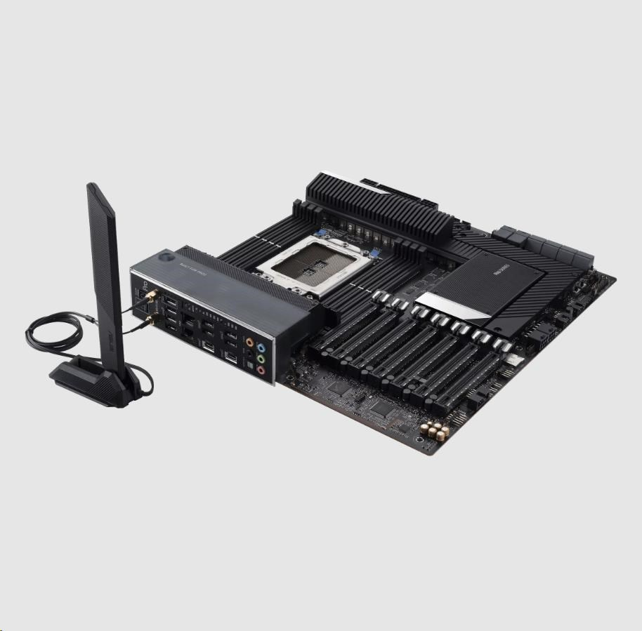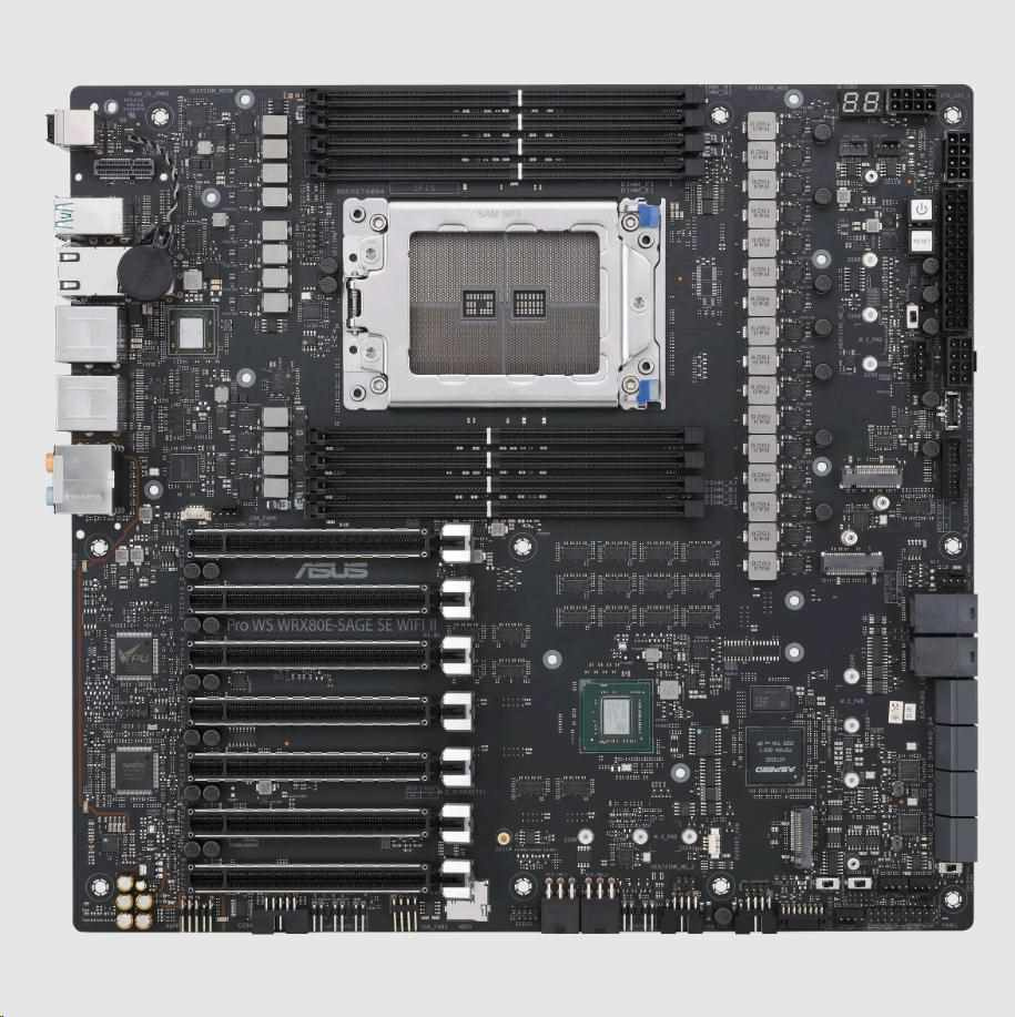 AMD WRX80 Ryzen™ Threadripper™ PRO extended-ATX workstation motherboard with Intel dual 10G LAN, USB 3.2 Gen 2x2 Type-C port, 7 x PCIe 4.0 x16 slots, 3 x M.2 PCIe 4.0, ASMB9-iKVM, 2 x U.2 and 16 power stages, and WIFI 6E