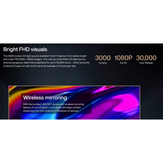 Bright FHD visuals: 3000-lumen LED light source with up to 30,000-hour lifespan