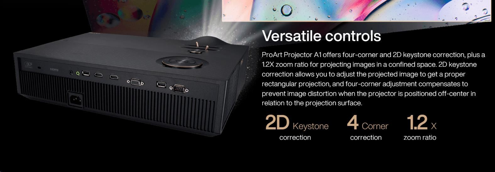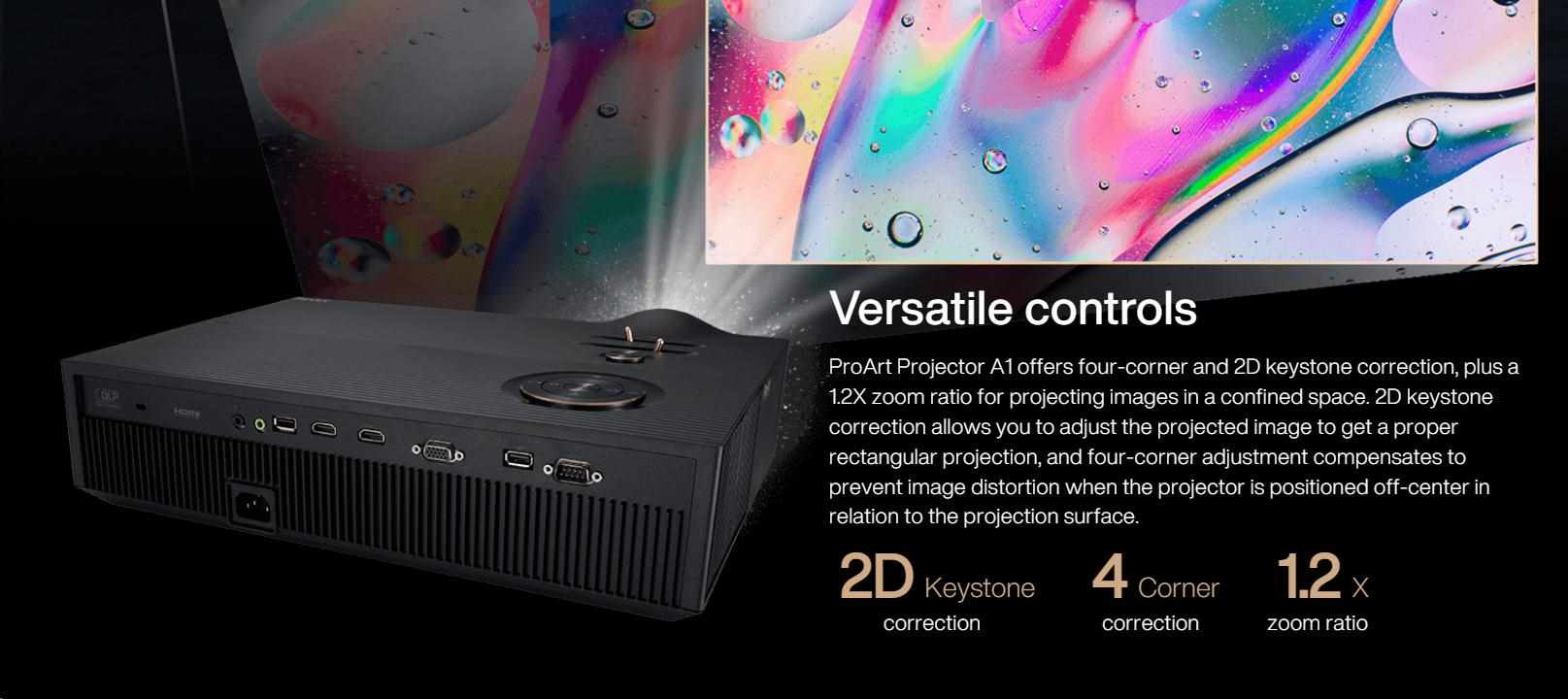 Versatile controls: Four corner and 2D keystone correction, plus 1.2X zoom ratio for large projections in confined spaces