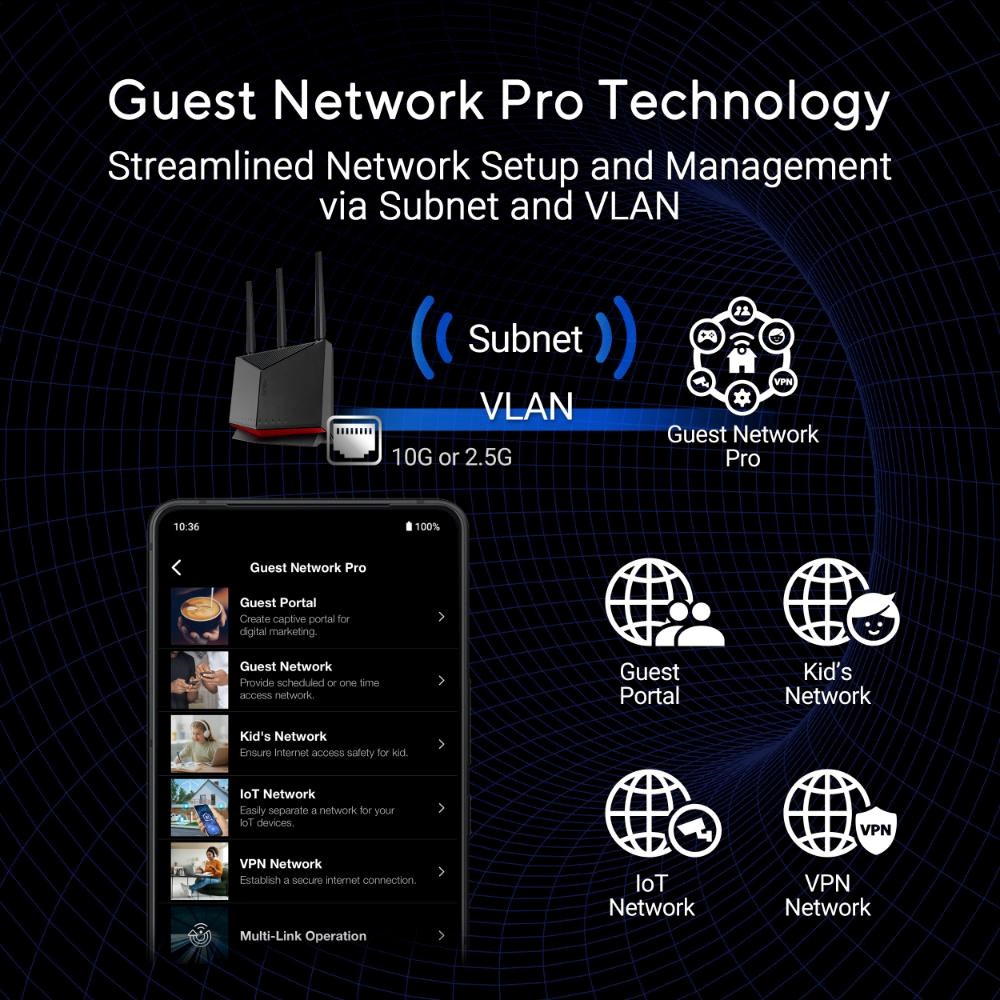RT-BE86U se může pochlubit dvoupásmovou technologií WiFi 7, která dosahuje bleskové rychlosti až 6800 Mb/s a zajišťuje bezproblémové streamování, hraní her a provádění datově náročných úloh. Ať už sledujete své oblíbené pořady, nebo spolupracujete na virtuální schůzce, tento router vám to umožní.