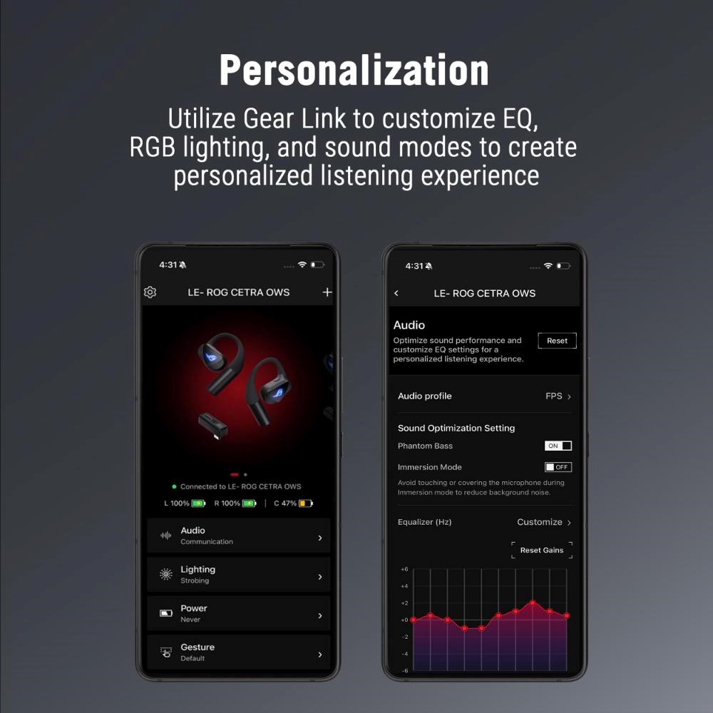 Herní sluchátka ROG Cetra Open Wireless s bezdrátovým připojením ve dvou režimech (Bluetooth a ultra-nízkolatenční technologie ROG SpeedNova 2,4 GHz), jednosměrným průchozím nabíjením přes USB-C, 14,2mm měniči Diamond-Like Carbon, otevřenou konstrukcí (open-ear), odnímatelným řemínkem na krk a čtveřicí mikrofonů s AI potlačením hluku.