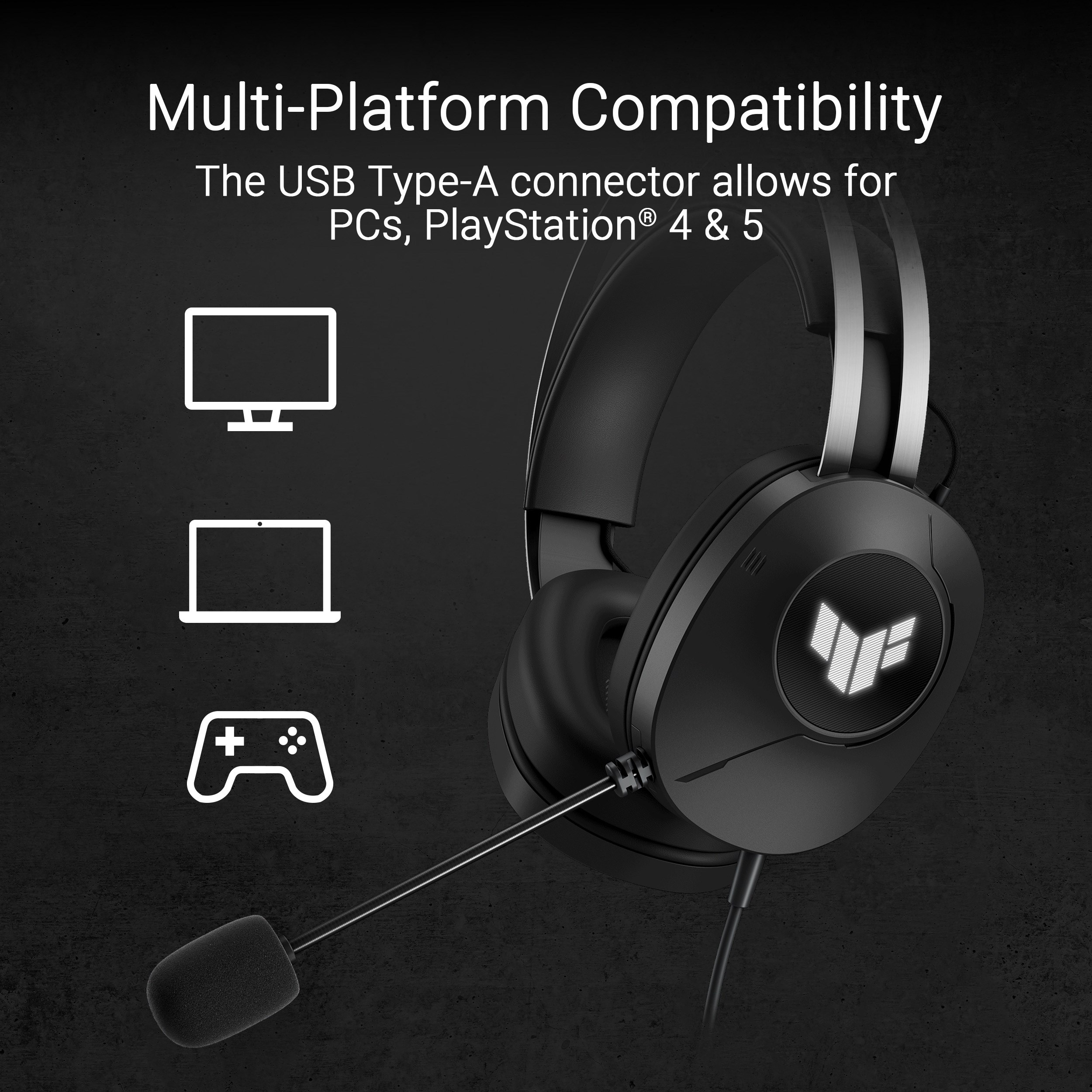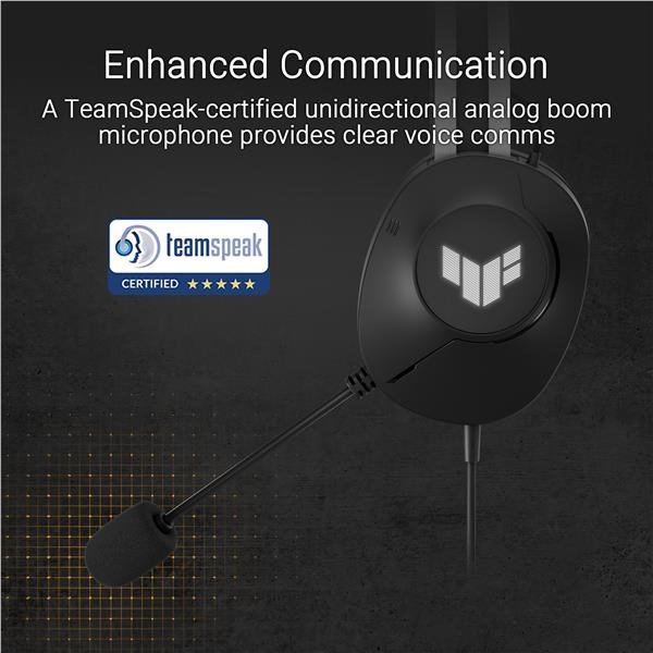Drátová herní náhlavní souprava s 40mm měniči ASUS Essence, virtuální 7.1 prostorový zvuk, mikrofon s certifikací TeamSpeak, lehká 297gramová konstrukce, odolné náušníky a podsvícení symbolického loga TUF
