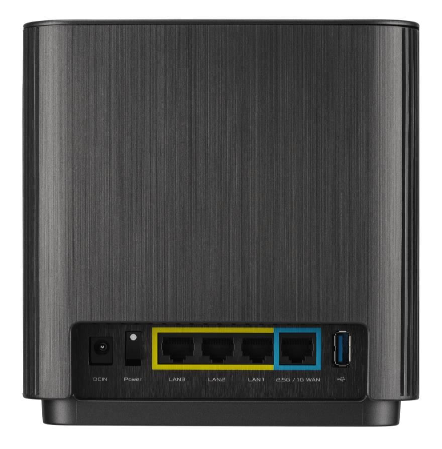 Wireless AX7800 Tri Band 2.5Gigabit Router WiFi 6 (802.11ax), 2402Mbps (5G-1) Wi-Fi 6 (802.11ax), 4804Mbps (5GHz-2) Wi-Fi 6 (802.11ax), 574bps (2.4GHz) Whole home mesh wifi system for large and multi-story homes Supports flexible SSID setting, wired inter-router connections AiProtection Pro network security powered by Trend Micro Ethernet 2.5Gigabits WAN x 1, LAN x 3 USB 3.1 Gen 1 x 1.