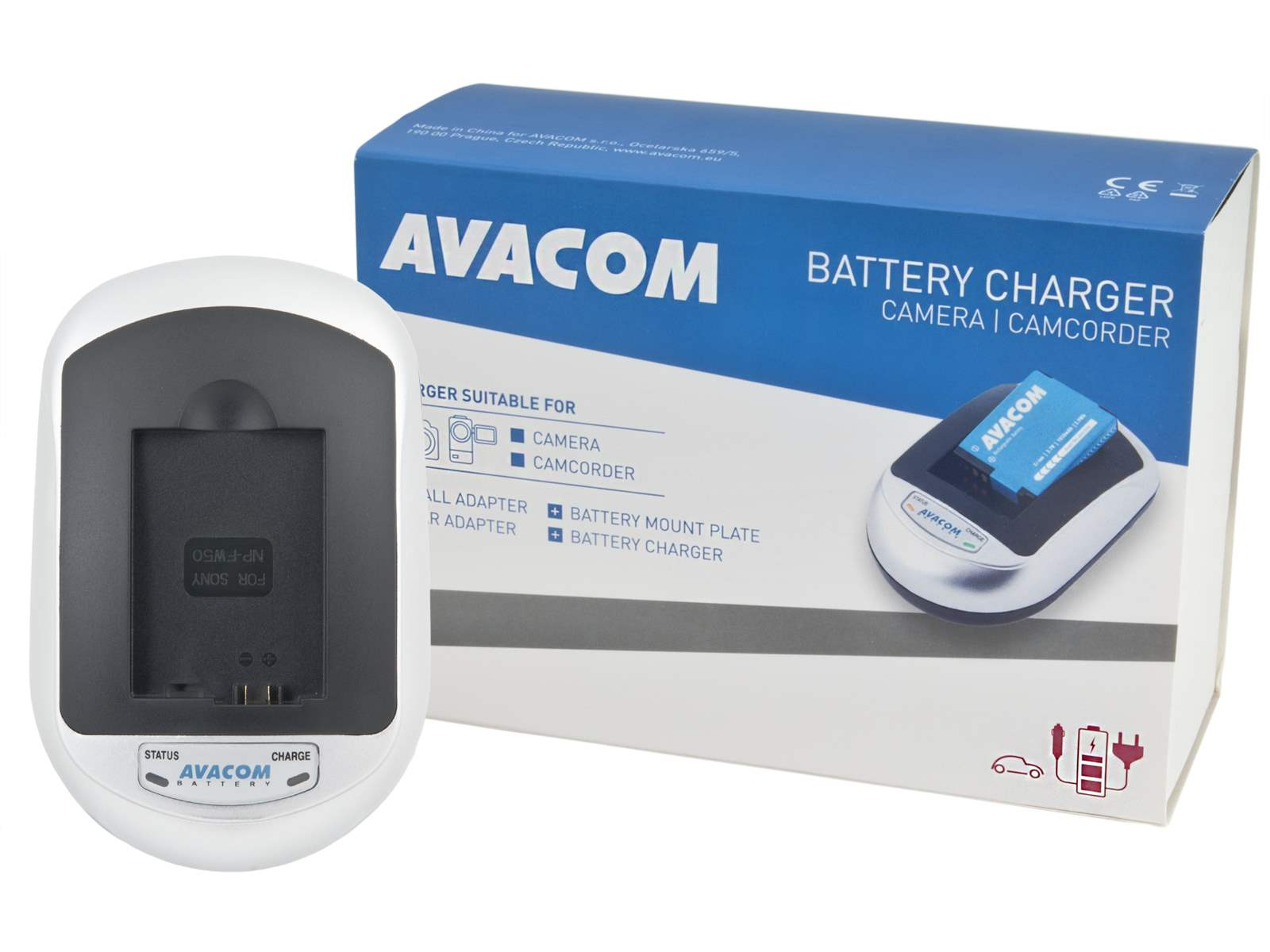 Balení obsahuje: nabíjecí základnu, redukci AVP, síťový adaptér na 100 - 240V, 12V autoadaptér do zapalovače, návod k použití.