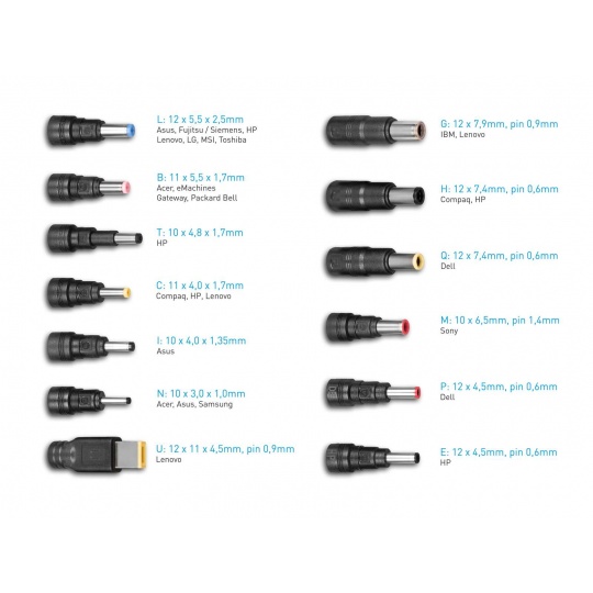 Univerzální nabíjecí adaptér pro notebooky AVACOM QuickTIP 65W dokáže se svými 13 různými konektory napájet drtivou většinu vyráběných notebooků oblíbených značek Acer, Asus, Compaq, Dell, Fujitsu/Siemens, Gateway, HP, IBM, LG, Lenovo, MSI, Packard Bell, Samsung, Sony, Toshiba, eMachines i jiných zařízení, vyžadujících napájení ze sítě.