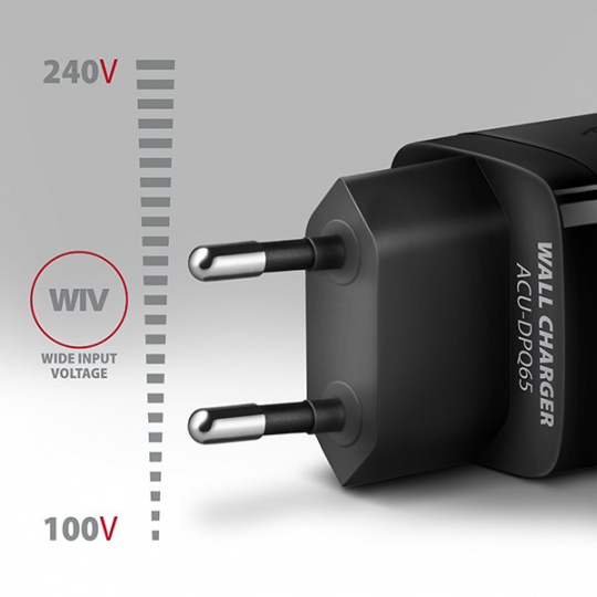 Cestovní nabíječka do sítě AXAGON ACU-DPQ65 GaN umožňuje rychlé nabíjení až tří mobilních zařízení současně. Díky celkovému výkonu 65W dokáže nabíječka dobíjet notebooky, telefony a další mobilní zařízení nejvyšší možnou rychlostí. Adaptér nabízí nejen standardní USB-A konektor, ale také dva oboustranné USB-C konektory.
