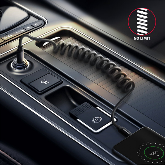 Odolný datový a napájecí kabel s prodlouženou životností je opatřen kovovými koncovkami, konektory s poniklovaným povrchem a pozlacenými kontakty. Vodiče kabelu jsou vyrobené z pocínované bezkyslíkaté mědi. Kvalitní izolace kabelu, vyrobená z flexibilního TPE, zaručuje maximální odolnost, ale zachovává i dostatečnou ohebnost. Díky kroucenému a natahovacímu provedení kabel zabírá minimum místa a je tak ideálním doplňkem do auta. Ve zkráceném stavu je kabel dlouhý jen 35 cm a nikde nepřekáží. V nataženém stavu pohodlně dosáhne 60 cm daleko od zásuvky.