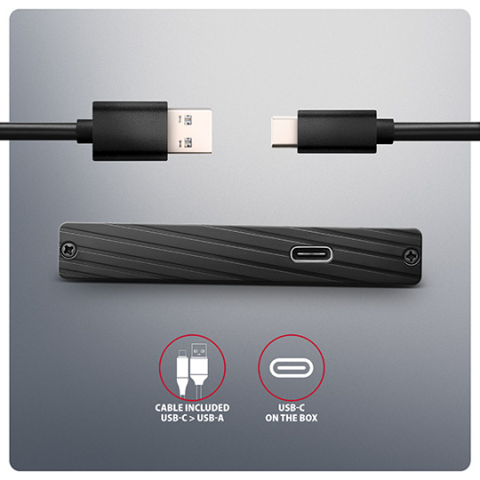 Kompaktní hliníkový externí AXAGON EE25-XA6C ALINE box s USB-C 5Gbps rozhraním určený pro 2.5" SATA pevné disky nebo SSD. Spolehlivé připojení k počítači umožňuje oboustranný USB-C konektor na boxu spolu s dodávaným kabelem USB-C -> USB-A.
