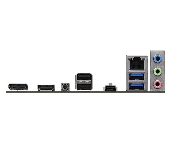 - 2 x Antenna Mounting Points - 1 x HDMI Port - 1 x DisplayPort 1.4 - 1 x USB 3.2 Gen1 Type-C Port - 2 x USB 3.2 Gen1 Type-A Ports - 2 x USB 2.0 Ports - 1 x RJ-45 LAN Port - 1 x BIOS Flashback Button - HD Audio Jacks: Line in / Front Speaker / Microphone