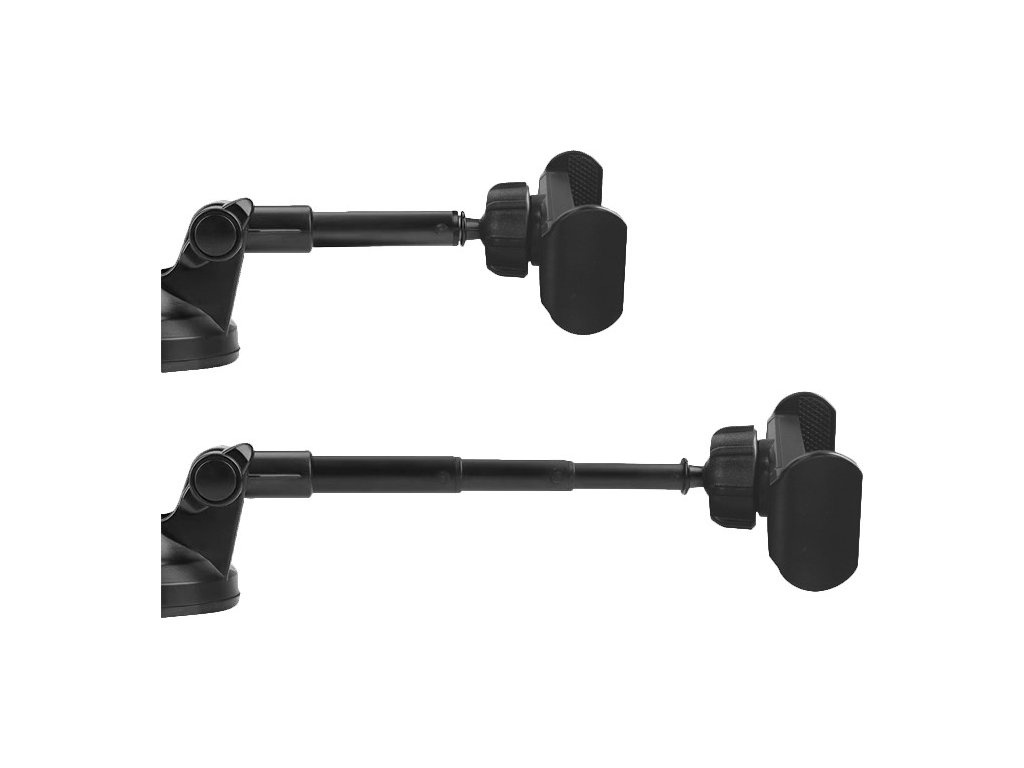 Univerzální držák v elegantním černém provedení je díky roztahovacím úchytům kompatibilní s každým zařízením s hloubkou 5,8 mm až 8,5 mm. Disponuje teleskopickou částí, která umožňuje polohování o 360 °. Instalace je možná na čelní sklo automobilu..
