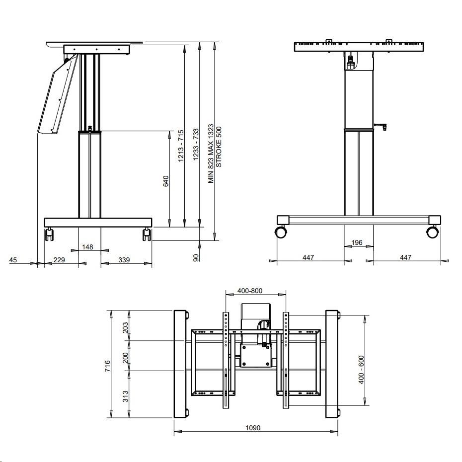Stojan na televize i monitory, který má plně motorizované nastavení výšky i náklonu obrazovky, ovládání pomocí ovládacího panelu. Kdykoliv můžete změnit výšku obrazovky v rozmezí od 788mm až do 1288mm (výška od podlahy po střed obrazovky) a náklon obrazovky od 0° (obrazovka je svisle) až do 90° (obrazovka je vodorovně) jednoduše a rychle pouhým stiskem tlačítka na dálkovém ovládání. Konstrukce Tv stojanu je profesionální kvality, zavěsit je možné televizory a monitory s hmotností až 150kg.