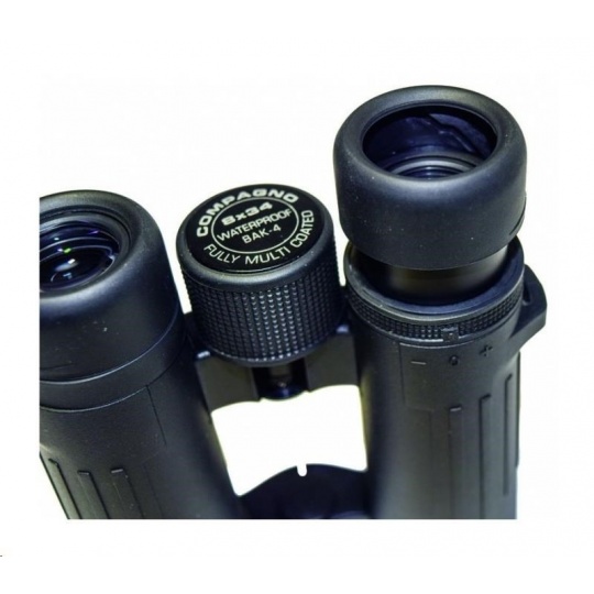 Dalekohled kompaktní COMPAGNO 10x34, zvětšení 10x, přední čočka 34mm, zorné pole 106m, ostré od 4m, optický výstup 3,3mm, vzdálenost středu očí 56-74mm s odstupem 16,0mm, světelnost 10,9, stmívání 18,4, rozměry 130x126x45 mm, hmotnost 450g, černý. Dalekohledy kompaktní DCF se střechovými hranoly BaK4 - ROOF (DACH). Modelová řada s moderním designem, malými rozměry, nízkou hmotností a vysokou optickou kvalitou pro kontrastní pohled i při zhoršených světelných podmínkách. Výkonný a odolný dalekohled s Fully Multicoated úpravou, hranoly z BaK4 skla, voděodolný do 0,5m/15min s ochranou proti zamlžení plněním Dusíkem, vhodné i pro sledování s brýlemi, nastavení +/-4 dioptrie, výsuvné krytky okuláru, stativový závit, pogumováné tělo z ABS. Včetně textilního pouzdra, popruhu a čistícího hadříku. Malý ale maximálně výkonný dalekohled do kapsy pro turistiku..