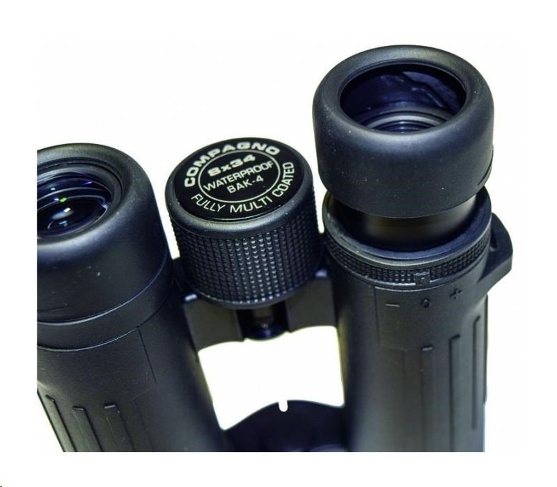 Dalekohled kompaktní COMPAGNO 8x34, zvětšení 8x, přední čočka 34mm, zorné pole 124m, ostré od 4m, optický výstup 4,2mm, vzdálenost středu očí 56-74mm s odstupem 17,4mm, světelnost 17,6, stmívání 10,9, rozměry 130x126x45 mm, hmotnost 450g, černý. Dalekohledy kompaktní DCF se střechovými hranoly BaK4 - ROOF (DACH). Modelová řada s moderním designem, malými rozměry, nízkou hmotností a vysokou optickou kvalitou pro kontrastní pohled i při zhoršených světelných podmínkách. Výkonný a odolný dalekohled s Fully Multicoated úpravou, hranoly z BaK4 skla, voděodolný do 0,5m/15min s ochranou proti zamlžení plněním Dusíkem, vhodné i pro sledování s brýlemi, nastavení +/-4 dioptrie, výsuvné krytky okuláru, stativový závit, pogumováné tělo z ABS. Včetně textilního pouzdra, popruhu a čistícího hadříku. Malý ale maximálně výkonný dalekohled do kapsy pro turistiku..