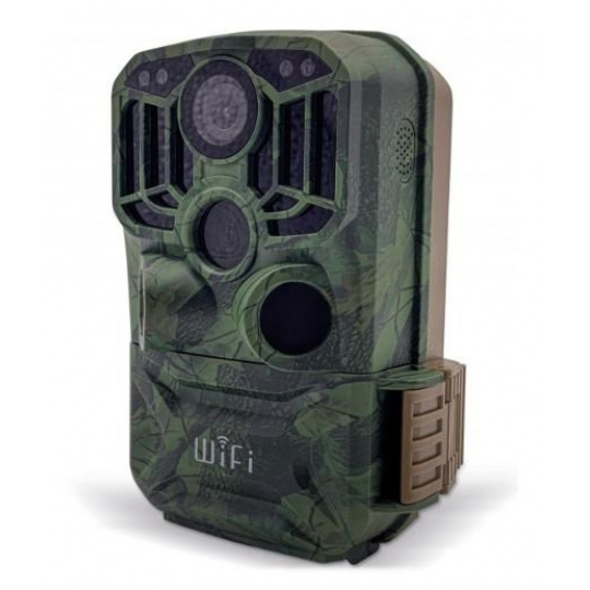 Fotopast s CMOS 8MP, objektivem 90° a WiFi komunikací s mobilem pomocí free App. Záznam 1-3 foto 24 MP nebo 5-180s video 2,7K, 3xPIR senzor 120°/ odezva 0,6s/ 34 Black IR LED do 20m, vnitřní 2" LCD, SD do 32GB, 8x AA baterie, rozměry 95x137x64mm, hmotnost 292g. Voděodolný přístroj dle IP66, barevné denní záběry a černobílé v noci, WiFi - free App pro kontrolu, stahování a živý náhled v dosahu přístroje, záznam datumu, času, teploty a fáze měsíce, PIR senzor má 3 citlivosti, interval mezi záběry 5s-60min, časosběrné záběry 5s-24h, stand-by až 6 měsíců, mikrofon, reproduktor. Slot SD, miniUSB, DC in 6V/2A pro externí zdroj, TV out, stativový závit, design camouflage. V dodávce kabely USB/TV out, dálkové ovládání, řemen a kovové uchycení s kulovou hlavou. BlackVision LED nejsou vidět ani při přímém pohledu na fotopast při expozici..