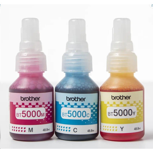Výhodné balení lahviček Brother BT5000CLVAL s azurovým, purpurovým a žlutým inkoustem. Každá barevná inkoustová lahvička vytiskne až 5000 stran.