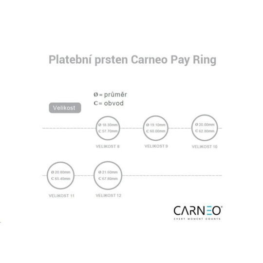Elegantní platební prsten Carneo, vyrobený z prémiové odolné keramiky, kombinuje vysokou odolnost vůči poškrábání, vodotěsnost a komfort nošení. Platby jsou realizovány bezkontaktním způsobem přes technologii NFC, bez nutnosti nabíjení. Aktivace a správa probíhají jednoduchým párováním přes aplikaci Carneo Pay, která využívá tokenizaci platby, čímž zaručuje bezpečnost. Prsten je kompatibilní s Android i iOS zařízeními, je odolný proti vodě podle standardu IP68 a je k dispozici v několika velikostech.