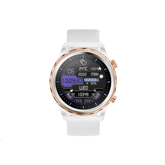 Moderní outdoorové fitness chytré hodinky Carneo Queen HR+ v elegantní bílé barvě se stříbrnou korunkou z nerezové oceli mají kulatý barevný displej SUPER AMOLED chráněný tvrdým minerálním sklíčkem. Umožňují měření srdečního tepu, stresu, BMI, ujeté vzdálenosti, monitorování spálených kalorií či kvality spánku. Obsahují 380mAh baterii s výdrží až 5 dní. Podle certifikace IP67 jsou odolné vůči vodě a prachu. Jsou kompatibilní s operačním systémem iOS a Android. Hodinky mají na dotek příjemný silikonový řemínek v černé barvě, který lze vyměnit za řemínek v jiné barvě či kožený nebo kovový a tím pádem změnit hodinkám sportovní vzhled za manažerský. Vkusný outdoorově-luxusní design se snadno kombinuje k obleku či volnočasovému outfitu. Hodinky i aplikace jsou kompletně v češtině, takže si budete jistě spolu dobře rozumět.