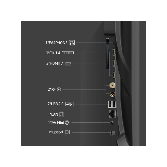 | Vstupy a výstupy: | AV vstup mini, CI+, sluchátkový vstup 3.5 mm, digitální audio výstup, HDMI 1.4, USB 2.0, LAN, antény RF a LNB |