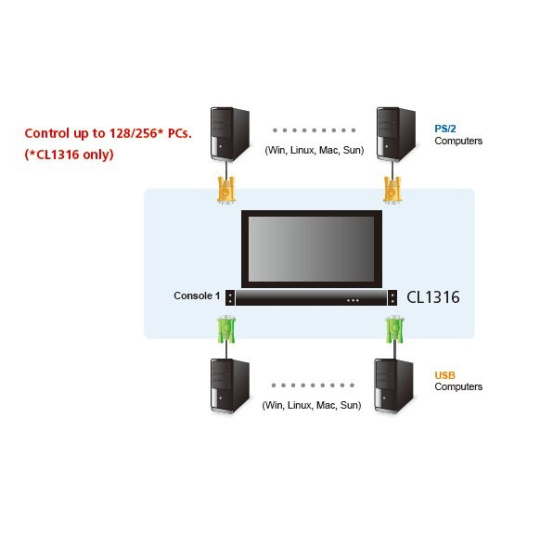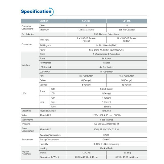 CL1316 ATEN 16-port KVM PS/2+USB, OSD, rack, 19" LCD, touchpad, klávesnice KVM přepínač s integrovanou klávesnicí, touchpadem a LCD 19" ve skladném vysouvacím šuplíku. Vhodný do serverové místnosti, kde Vám ušetří místo. Ke KVM přepínači je možno připojit až 16 PC s rozhraním USB nebo PS/2, je montovatelný do racku. Možnost přepínač ovládat tlačítek, klávesovou zkratkou nebo přes vestavěné OSD menu. - vestavěný 16 port KVM přepínač - vestavěný LCD 19" - kompletní klávesnice, touchpad - rozlišení LCD až 1280x1024@75 DDC2B - možnost připojit/odpojit PC bez restartu přepínače - není třeba software - přepínání pomocí hot key, tlačítka, OSD menu - auto scan mod pro zjištění připojených PC - kaskádovatelný - signalizace stavu pomocí několika LED diod - možnost připojit počítače po USB i PS/2 (řeší se kabely) - Broadcast mod - operace se realizuje na všech připojených PC najednou - včetně úchytů do racku 19" - dvou úrovňová ochrana heslem - podpora systémů Windows/Mac/Linux/Sun - černá barva Specifikace: konektory pro vstup sdružený 15p Canon třířadý Female (je třeba použít sdružený kabel!) Vhodné kabely: USB 2L-5202U 2L-5203U 2L-5206U PS/2 2L-5202P 2L-5203P 2L-5206P V balení: 1ks CL1316 KVM přepínač s držákem do racku 1ks napájecí kabel 2ks sady kabelů KVM pro připojení počítače 1ks Firmware Upgrade kabel 1ks Rychlý návod