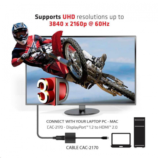 CAC-2170 Club 3D je aktivní převodník signálu HDMI ™ 2.0. Adaptér Mini DisplayPort ™ 1.2 na HDMI ™ 2.0 UHD je nejjednodušší řešení pro připojení vašeho herního PC nebo notebooku, které obsahují port Mini DisplayPort ™ 1.2, k televizoru, monitoru nebo projektoru s podporou HDMI ™. Adaptér je kompatibilní se specifikací HDMI ™ 2.0, což umožňuje propustnost 6Gbps TMDS na každý kanál. Rozhraní adaptéru má tři trasy pro data HDMI, hodiny, signál HPD a napájení, které nabízejí celkovou propustnost 18 Gb/s TMDS.