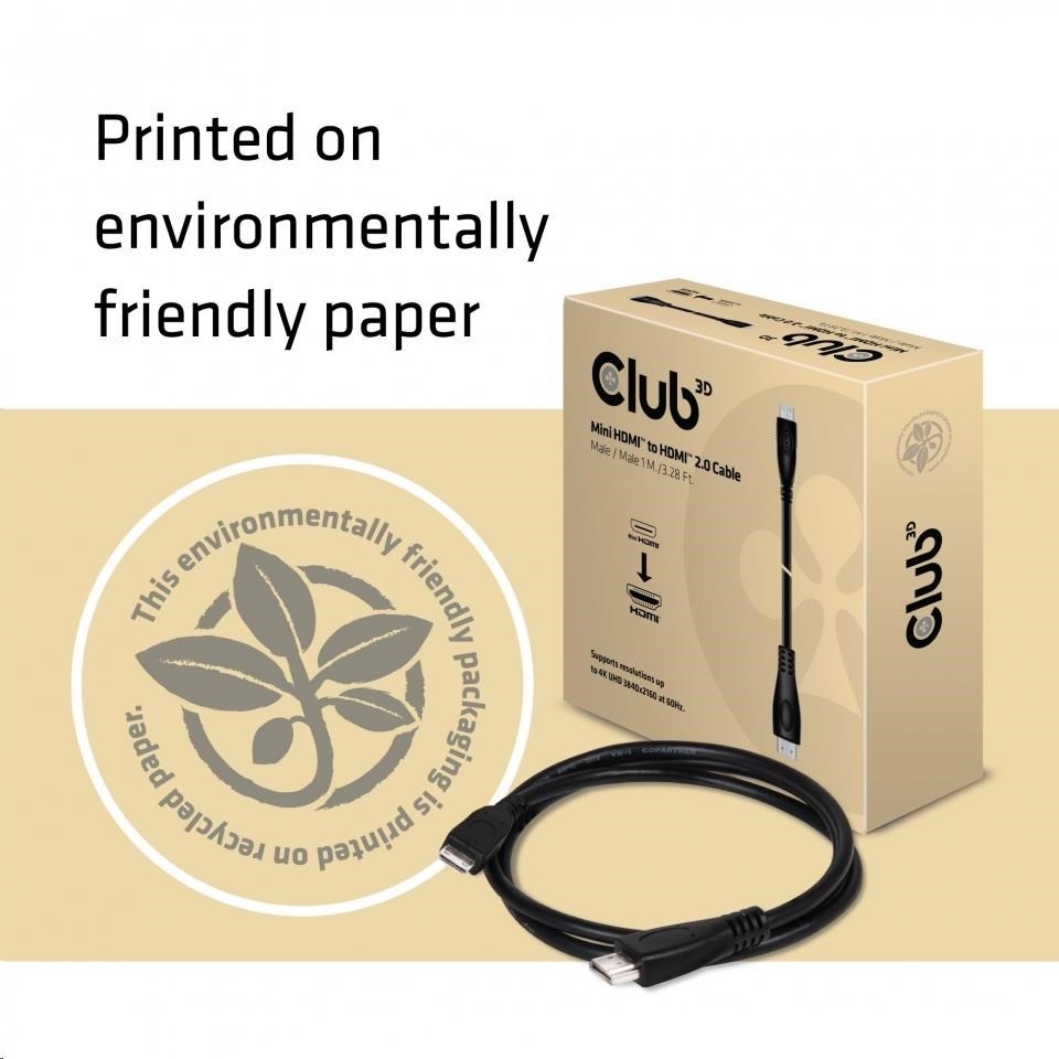 Kabel Club 3D Mini HDMI ™ na HDMI ™ 2.0 poskytuje rozlišení UHD signálu pro jasný, přirozený obraz a zvuk. Umožňuje připojení digitálního fotoaparátu / videokamery, mini počítače, projektoru Pico nebo jiného zařízení s výstupem Mini HDMI ™ do televizoru 4K UHD, monitoru nebo projektoru s konektorem HDMI ™. Plně podporuje vysokorychlostní rozhraní HDMI ™ s Ethernetem, což zaručuje, že je podporováno video až do 4K UHD 3840x2160p při 60Hz, stejně tak zvukové a datové toky.