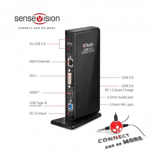 Díky čipu DisplayLink ™ DL-3900 je možné k dokovací stanici připojit dva externí monitory s vysokým rozlišením prostřednictvím výstupů HDMI ™ a DVI-I. Má ethernetový port RJ 45 pro spolehlivé a rychlé drátové připojení k síti a nabízí celkem 6 portů USB pro periferie a paměťové zařízení, stejně jako výstup zvuku a mikrofonu. To vše je připojeno k vašemu zařízení pomocí jediného kabelu USB.